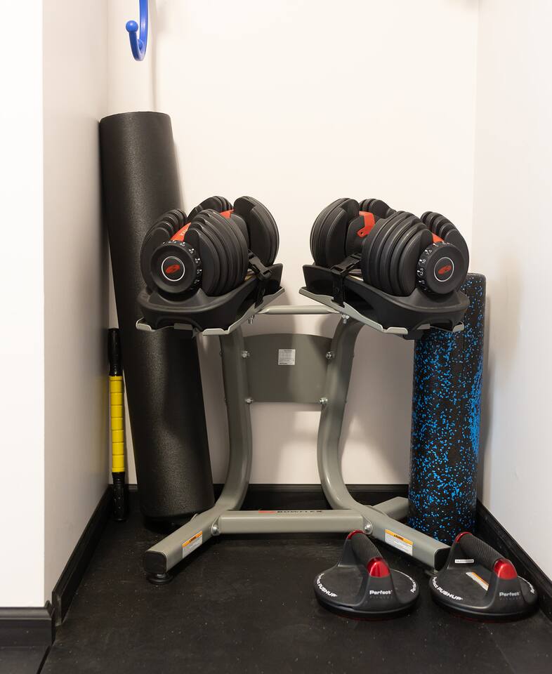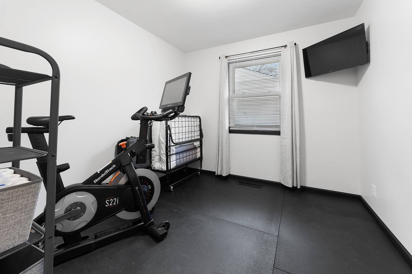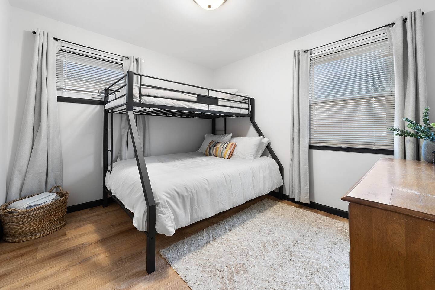 In total you'll find two full bedrooms and a third flex room, complete with workout equipment and a roll-away full bed. In the first bedroom you have a queen sized bed and the second has a twin bed bunked over a queen bed. You'll find the kitchen fully equipped and ready for you to whip up some tasty cakes or whatever other goodness your heart desires, and you'll have space to dine together, work from home as needed, and a central location from which to explore the greater Lafayette area.